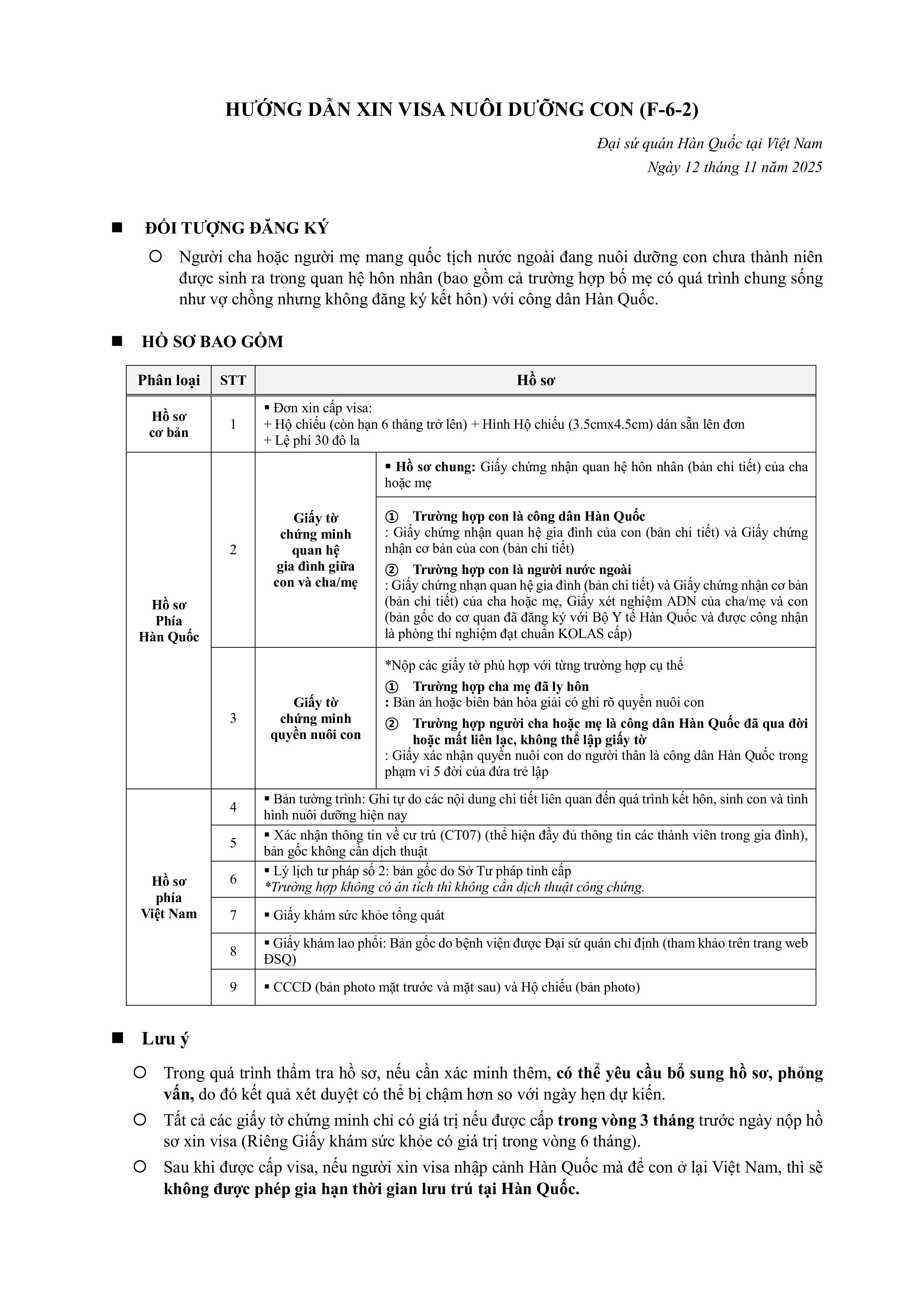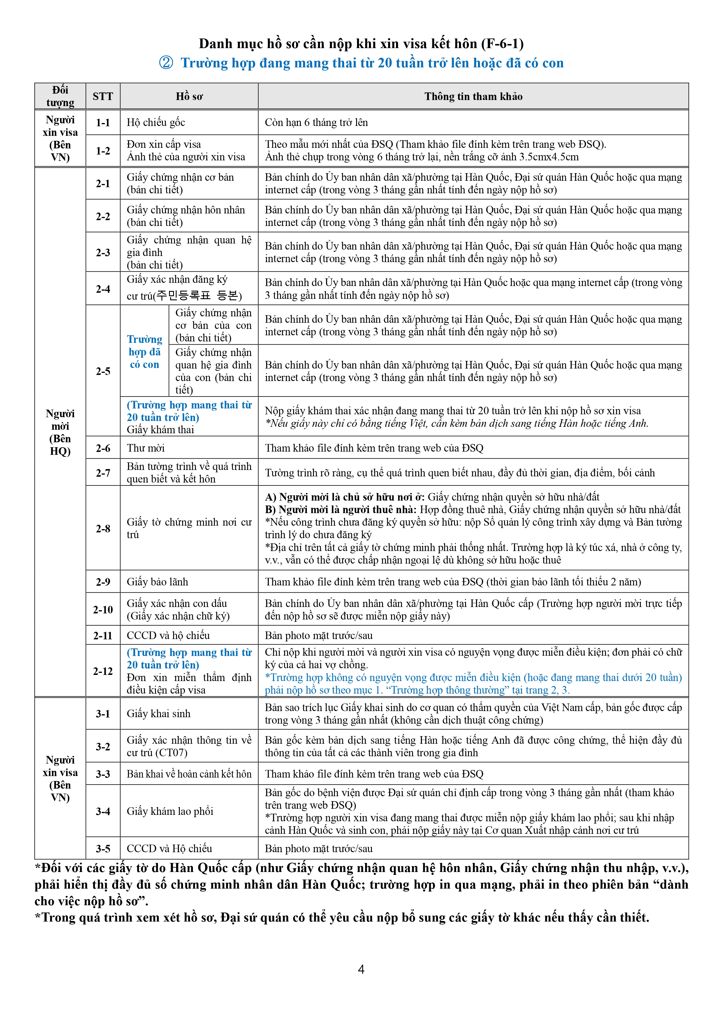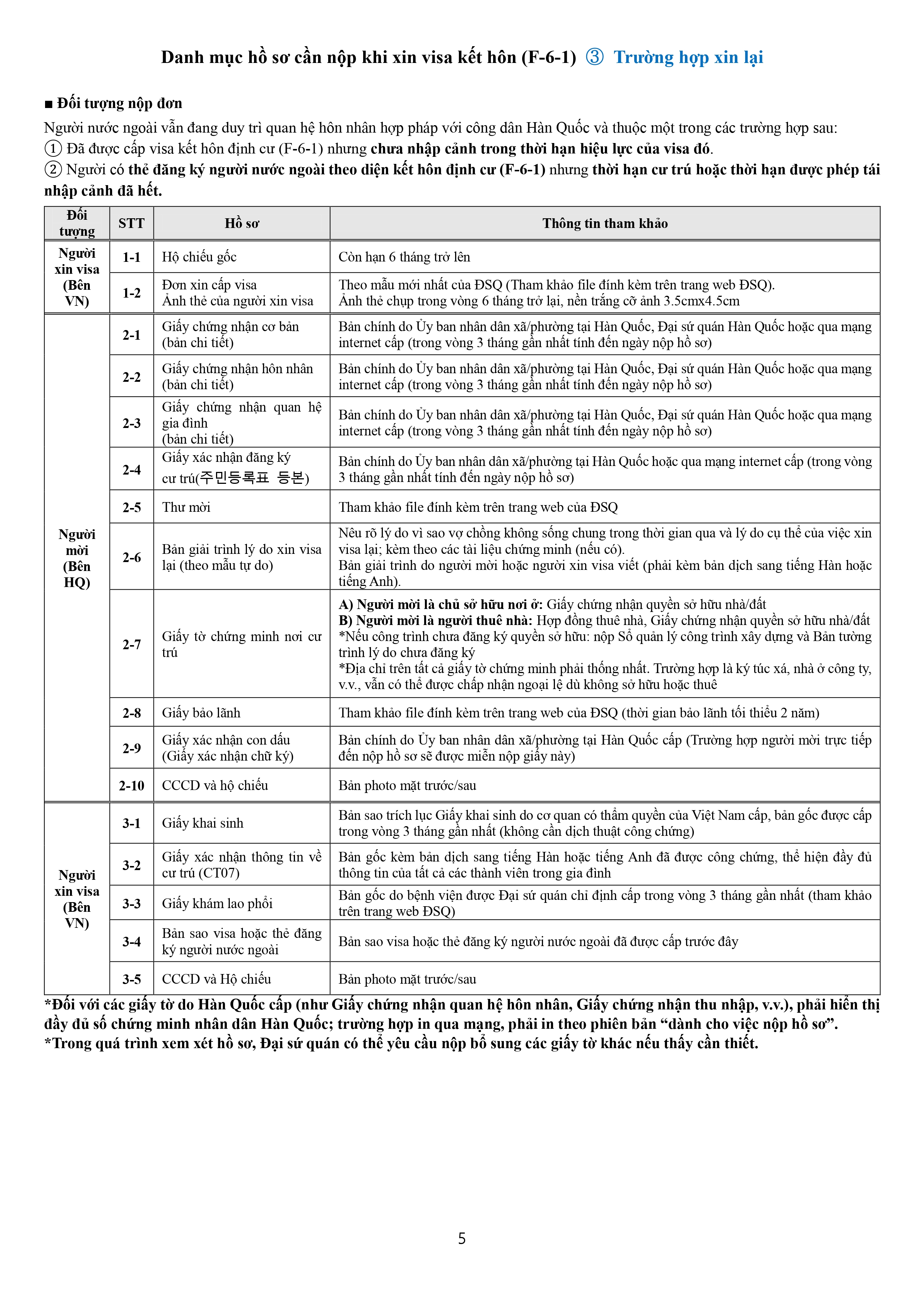 1. Giấy chứng nhận cơ bản (chi tiết) 2. Giấy chứng nhận quan hệ hôn nhân (chi tiết) 3. Giấy chứng nhận quan hệ gia đình (chi tiết) 4. Hộ tịch Hàn Quốc 5. Thư mời (đóng dấu cá nhân) 6. Giấy chứng nhận đóng thuế thu nhập cá nhân 7. Giấy tờ chứng minh nghề nghiệp 8. Xác nhận thông tin về tín dụng 9. Các giấy tờ liên quan đến nhà đất 10. Giấy bảo lãnh của chồng/vợ người HQ (đóng dấu cá nhân) 11. Giấy chứng nhận dấu cá nhân của chồng/vợ người HQ 12. Giấy khám sức khỏe (thần kinh+HIV+bệnh giang mai) 13. Giấy chứng nhận chương trình kết hôn quốc tế 14. Chứng minh thư và hộ chiếu (có chữ ký người mang hộ chiếu)(bản sao) | 1. Hộ chiếu gốc (còn hạn 9 tháng trở lên) 2. Đơn xin cấp visa (dán ảnh nền trắng 3,5x4,5 chụp trong vòng 6 tháng gần nhất.) 3. Ảnh cưới (chụp tại lễ cưới và ảnh hẹn hò) 4. Giấy khai sinh (dịch thuật tiếng A/H công chứng tư pháp trong vòng 3 tháng gần nhất) 5. Sổ hộ khẩu (dịch thuật tiếng A/H công chứng tư pháp trong vòng 3 tháng gần nhất) 6. Bản khai kết hôn (có mẫu) 7. Bản tường trình dẫn đến việc kết hôn (dịch thuật tiếng Anh/ Hàn trong vòng 3 tháng gần nhất) 8. Lý lịch tư pháp số 2 do Sở tư pháp cấp tỉnh/thành phố cấp (Bản gốc+dịch thuật tiếng A/H công chứng tư pháp trong vòng 3 tháng gần nhất) 9. Giấy khám sức khỏe(thần kinh+HIV+bệnh giang mai) 10. Giấy khám sức khỏe lao phổi(Bệnh viện do ĐSQ chỉ định) 11. Các bằng cấp, chứng chỉ giao tiếp 12. Chứng minh thư và hộ chiếu (có chữ ký người mang hộ chiếu) (bản sao) 13. Nội dung tin nhắn trò chuyện |