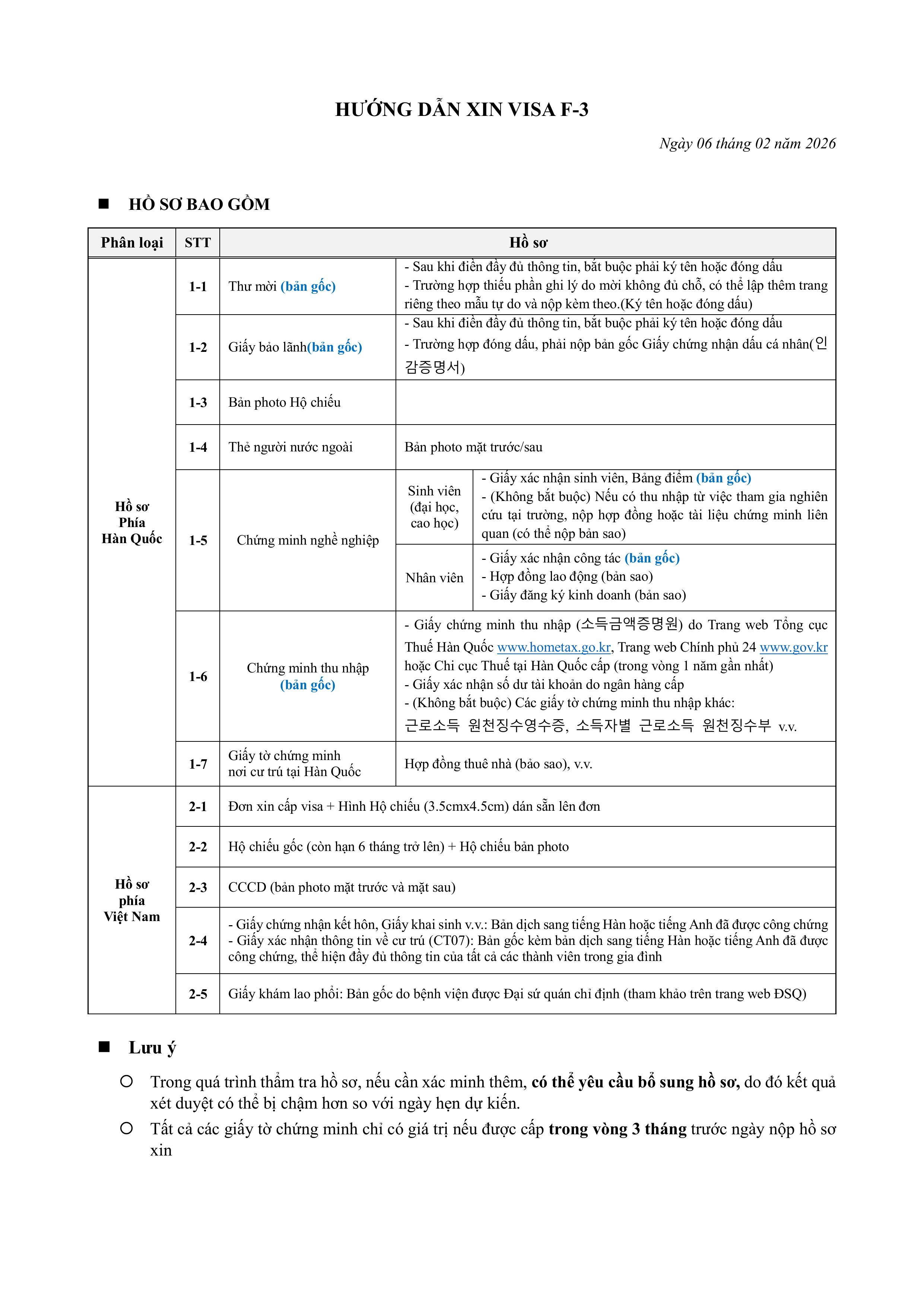 5. Các giấy tờ chứng minh cho việc học tập hoặc làm việc tại Hàn Quốc Sinh viên đang học tập tại Hàn Quốc: Giấy xác nhận đang học tại trường, Bảng điểm Người đang làm việc tại Hàn Quốc: Giấy xác nhận nghề nghiệp do công ty cấp, Bản sao hợp đồng lao động, Giấy đăng ký kinh doanh công ty đang làm, Giấy chứng nhận nộp thuế 1 năm gần nhất